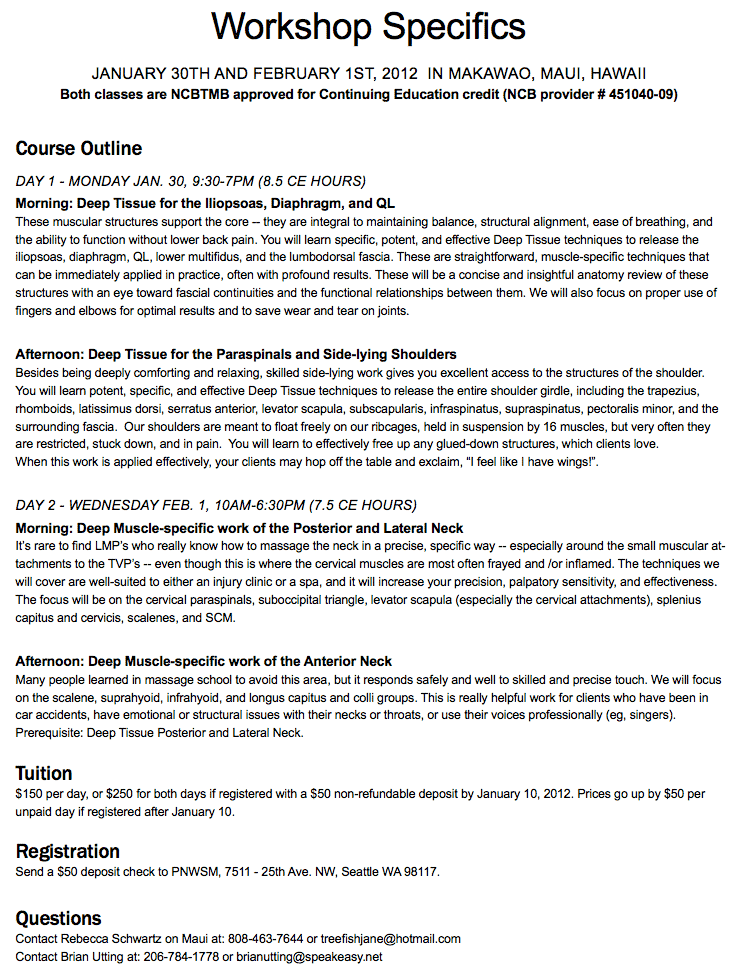 Increase your precision, palpatory sensitivity, and effectiveness. Learn to contact the body's core in a deep, precise, muscle-specifity way. Practice specific, poten, effective deep tissue techniques that skillfully work w/ the body's muscular structure.
