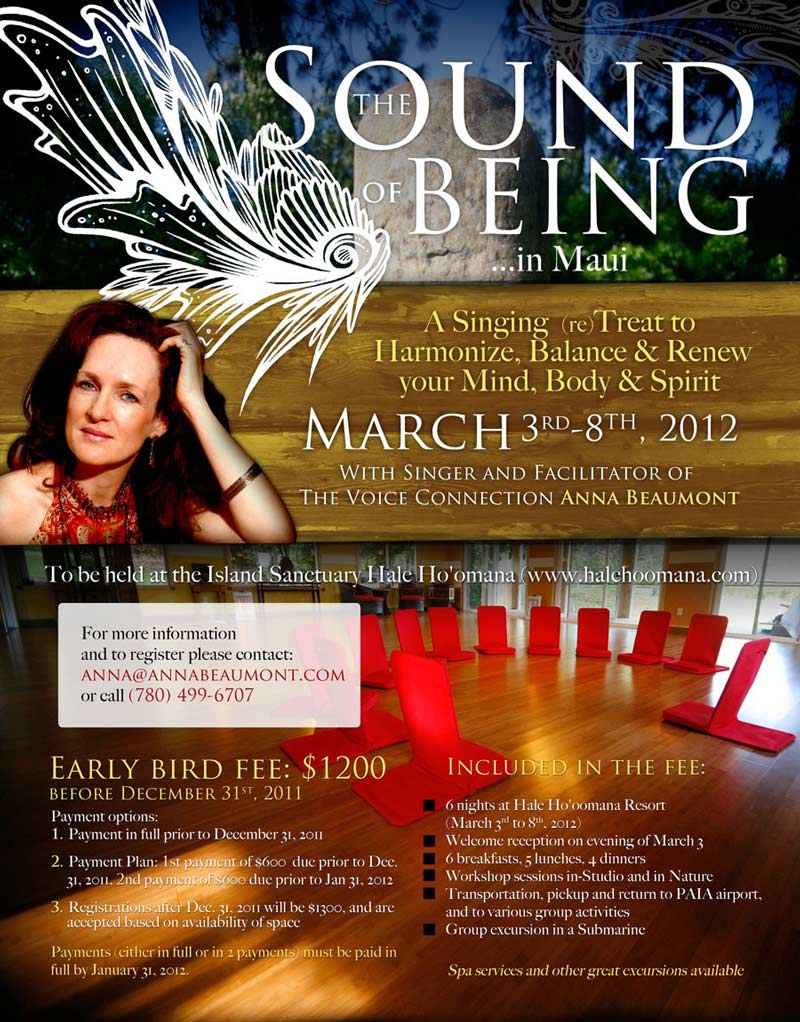 A singing (re) treat to harmonize, balance, and renew your mind, body and spirit. An accomplished jazz and pop singer for over 20 years, Anna’s performances have taken her all over the world. Anna is a Singer, Composer, Teacher, Integrative Body Psychotherapist and Workshop Facilitator.